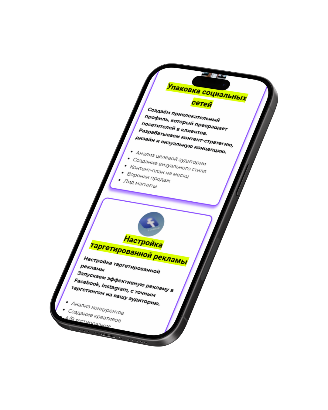 Создаём привлекательный профиль, который превращает посетителей в клиентов. Разрабатываем контент-стратегию, дизайн и визуальную концепцию.